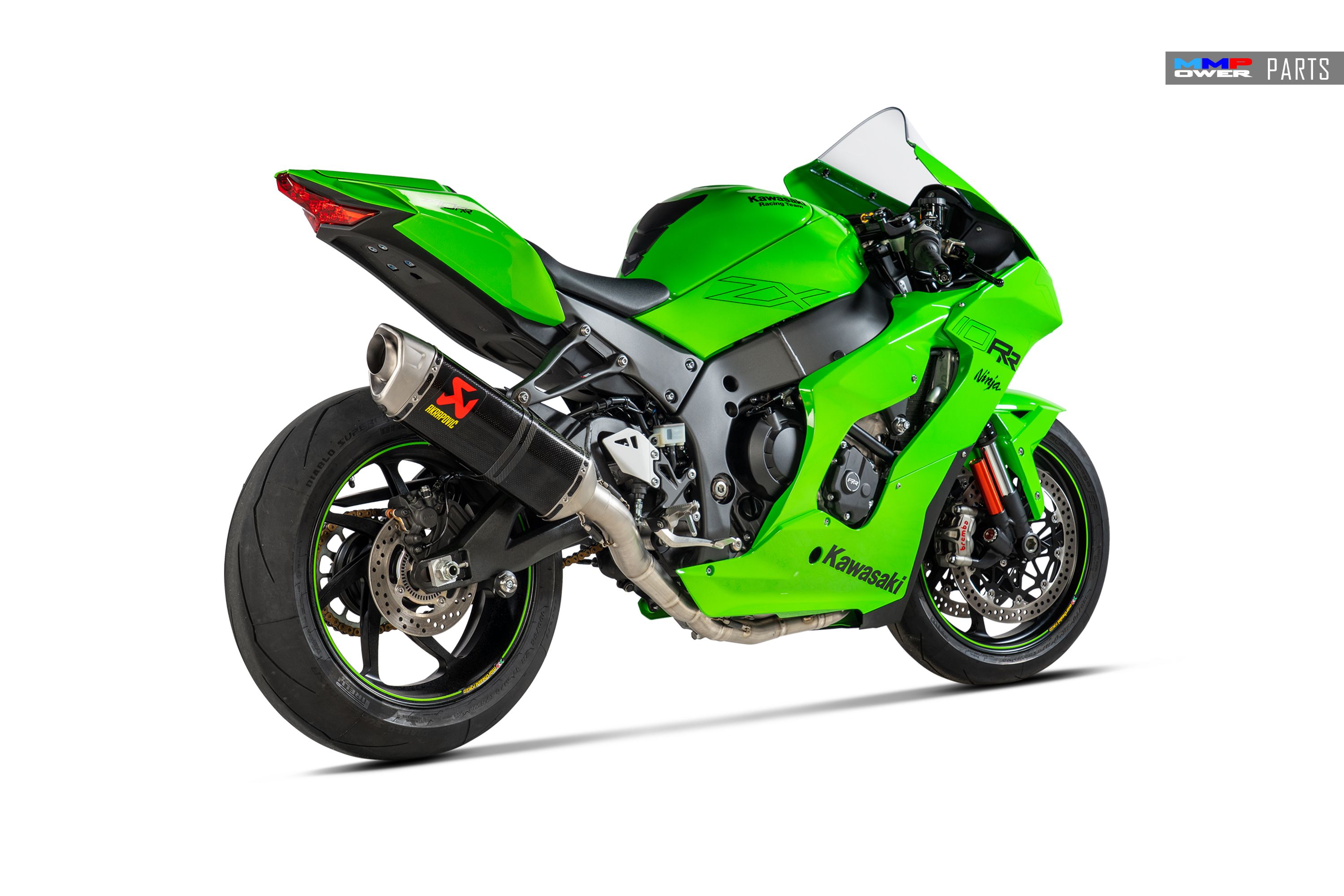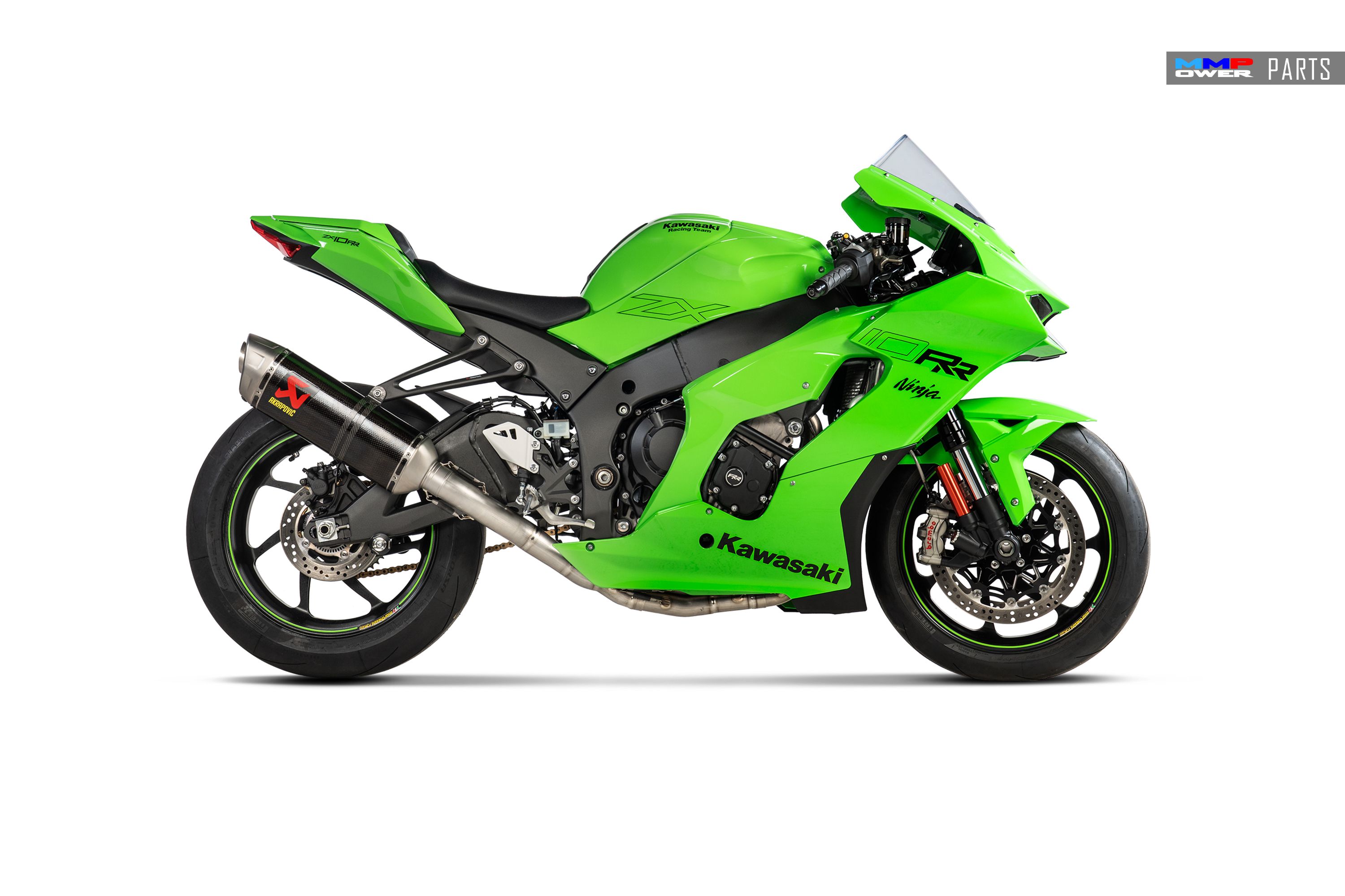 Kaplanmış karbon fiber susturucu dış manşonu ve yüksek kaliteli titanyum uç kapağı ile eksiksiz bir paslanmaz çelik egzoz sistemidir. Racing Line ile güç ve tork seviyeleri, Akrapovič'in şirket içi dyno'sunda Racing Line (Titanyum) egzoz ile Kawasaki'nin arka arkaya testlerinde kaydedilen ekstra 8,2 Kw (11,1 HP) ve 13,4 Nm artırıldı. ve standart egzoz sistemine sahip bir Ninja ZX-10RR Tüm devir aralığı boyunca doğrusal dağıtımla birleştiğinde, ağırlığı azaltmak için titanyum iç parçalar dahil olmak üzere altıgen bir susturucu ve derin bir sportif ses ile birlikte gelir. Bu sistemin güzel görünümünü tamamlamak için alüminyum susturucu braketi ekleme seçeneği de mevcuttur. Racing Line sistemi kurulduğunda motosikletin ECU'sunun yeniden eşlenmesi gerekir.