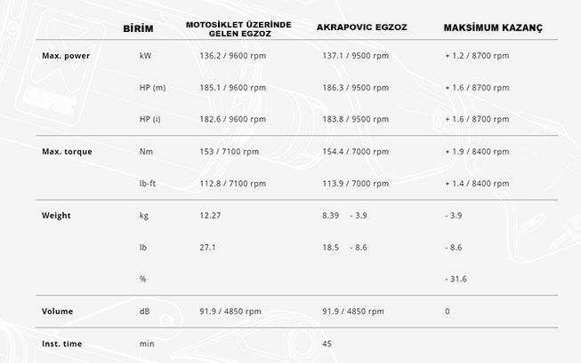 Her birinde Euro 5 EC/ECE tip onayına tamamen uygun katalitik konvertör bulunan iki yenilikçi ve aerodinamik susturucu, motosikletin tasarımına mükemmel uyum sağlar. Susturucular üzerindeki siyah kaplamalı hafif titanyum dış manşon ve yüksek kaliteli paslanmaz çelik bağlantı borularının yanı sıra karbon fiber uç kapakları ve karbon fiber ısı kalkanlarından üretilen egzoz , standarttan %31,6 daha hafiftir. Lazerle işlenmiş Akrapovič logosuna sahip bu sistem, sürücüye motosikletin motorunu ve performansını hissettirmek için harika bir gaz tepkisine sahiptir ve aynı zamanda 8.700 dev/dk'da 1,2 kW (1,6 hp) ve 8.400 dev/dk'da 1,9 Nm tork ekler. Canlı, sportif ve derin bir müzik, egzoz gazına başka bir boyut katıyor ve duyuları daha da heyecanlandırıyor. Yeniden eşleme gerektirmeyen, basit bir tak ve çalıştır ürünüdür.