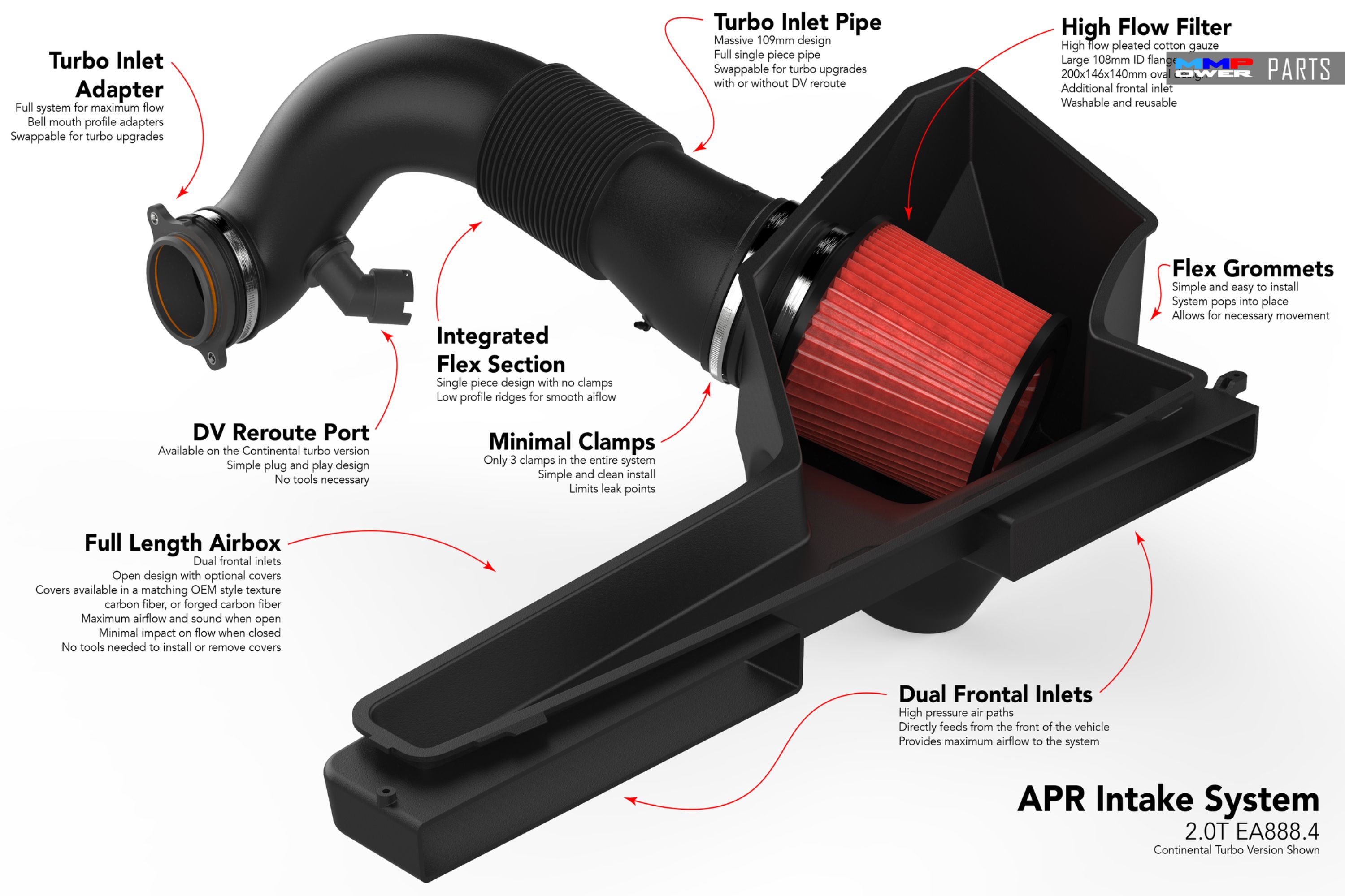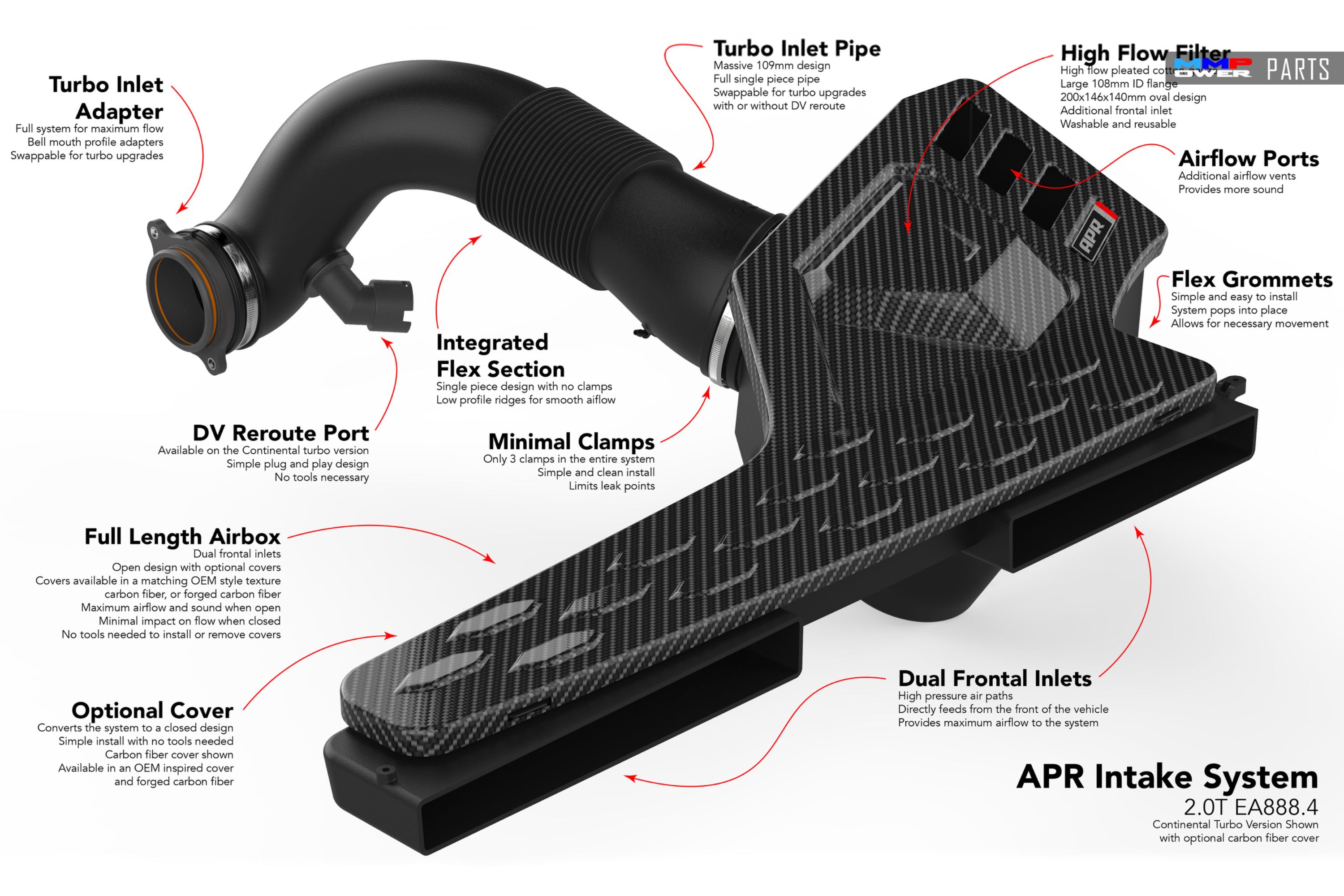 Öndeki çift giriş kepçesinden doğrudan turboya bağlanır, birlikte verilen Turbo giriş adaptörüne kadar tam 109 mm'lik gerçek bir giriş sistemidir.