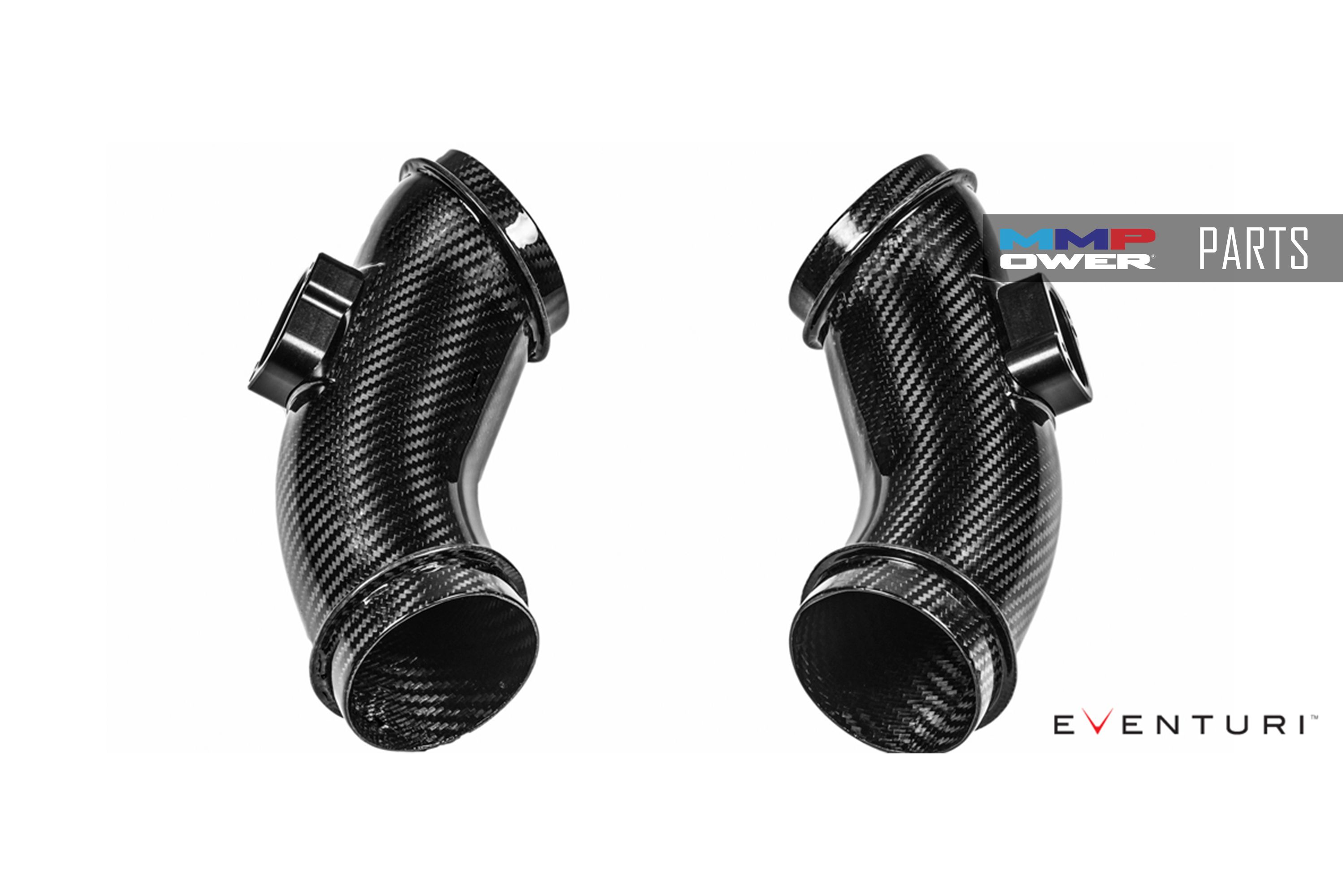 Giriş borularımız yine %100 prepreg karbon fiberden üretilmiştir. Her boruda alüminyumdan CNC işlenmiş entegre bir MAF sensör yuvası bulunur. Borular filtre muhafazalarını turbo girişlerine düzgün bir şekilde bağlar ve çok daha bozucu bir akış yoluna sahip olan stok oluklu esnek boruları ortadan kaldırır. Karbon boruların gerçek bir dairesel kesite sahip olmasını sağladık - en iyi olası akış özellikleri için MAF çıkıntısında bile.