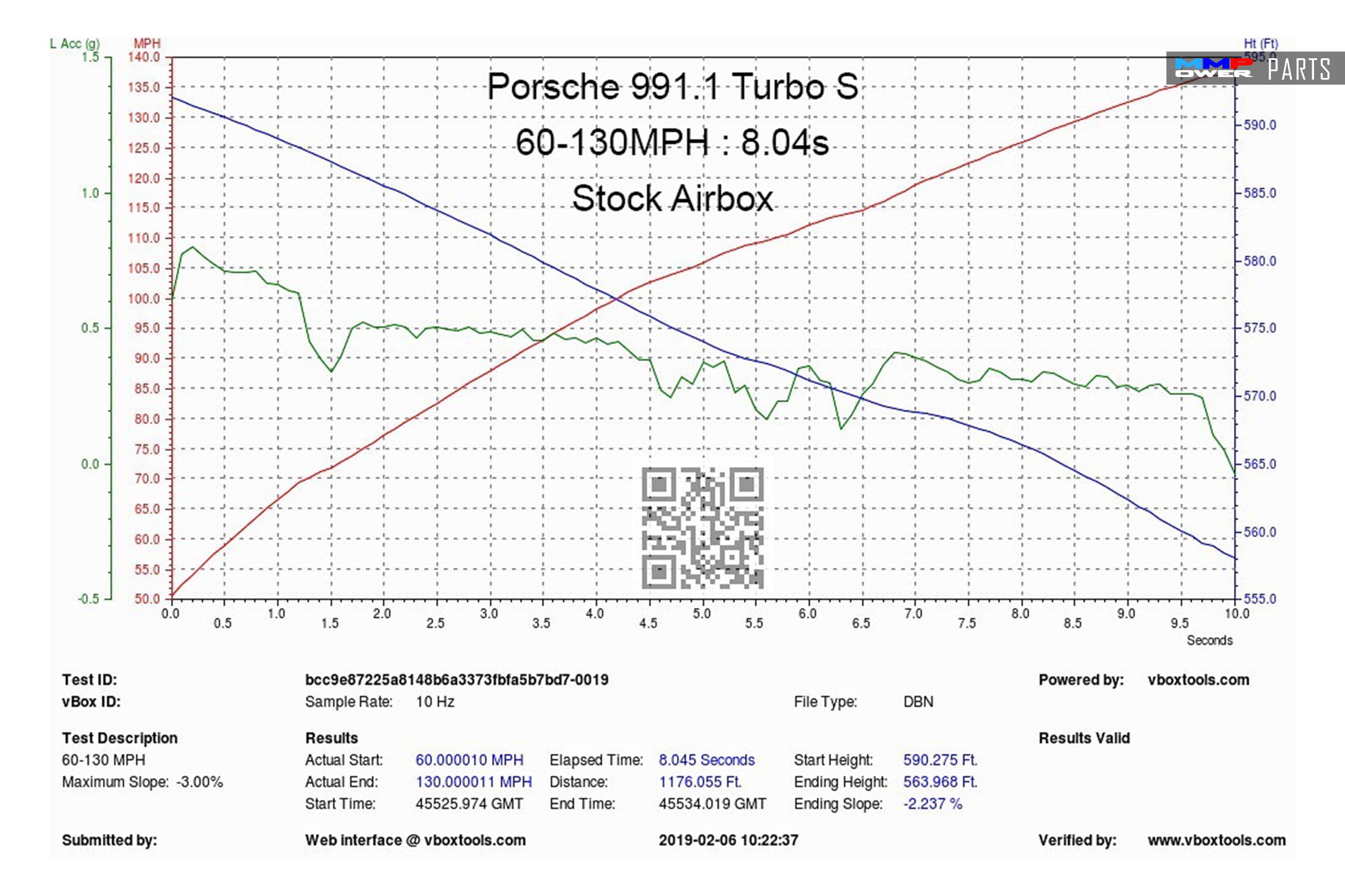 The intake was tested on the road using a Vbox unit to record the acceleration from 60-130mph . Testing was carried out on the same stretch of road - again on the same day to keep variables minimum. Results show that with just the intake added - on stock software, the acceleration times from 60-130mph reduced by 0.2 seconds which is a significant improvement at such speeds.Acceleration results summary:- 60-130mph with Stock intake = 8.04 seconds
