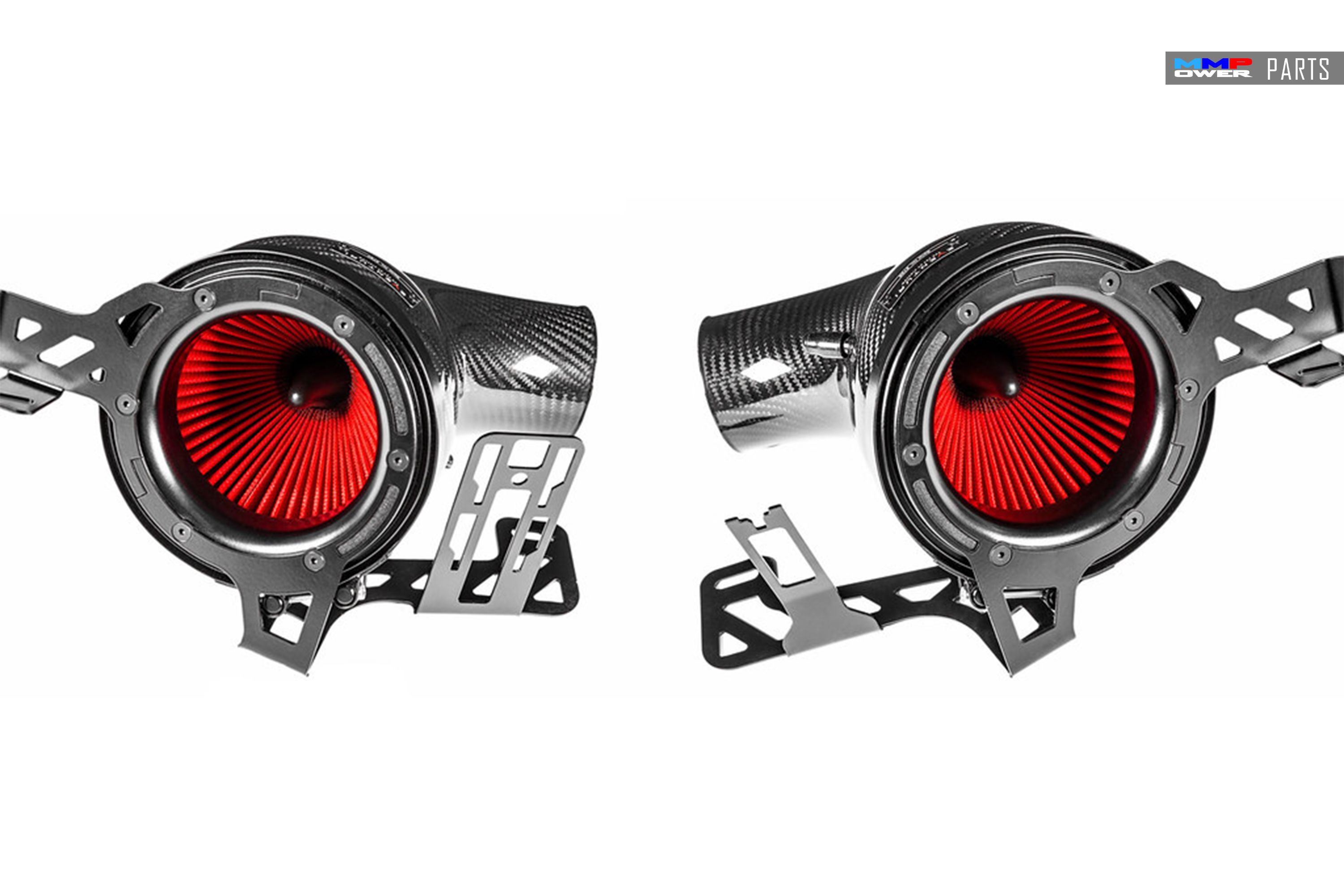 The filter housings comprise of our bespoke generation 2 filters, aluminium inlet cowls, the carbon pods and integrated tubes. The carbon pods shroud the reverse mounted filters and smoothly shape the airflow down to the stock turbo inlet tubes. By separating the inlet path and having a dedicated filter for each turbo, the intake allows the turbos to function more efficiently. Crucially, the Venturi housings organically extend with a smooth curve from the filter opening to the stock turbo tubing. This ensures that the airflow remains as smooth as possible throughout the system. Smooth airflow results in less drag and therefore the turbos can reach peak boost sooner in the RPM range. It also means that the throttle response feels sharper.